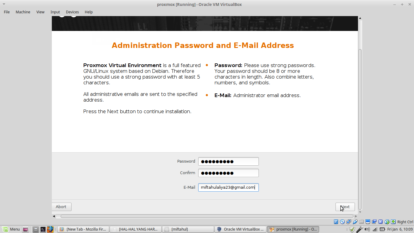5.berikutya kamu diwajibkan mengisi password dan email di proxmox.secara default memiliki user root.klik next